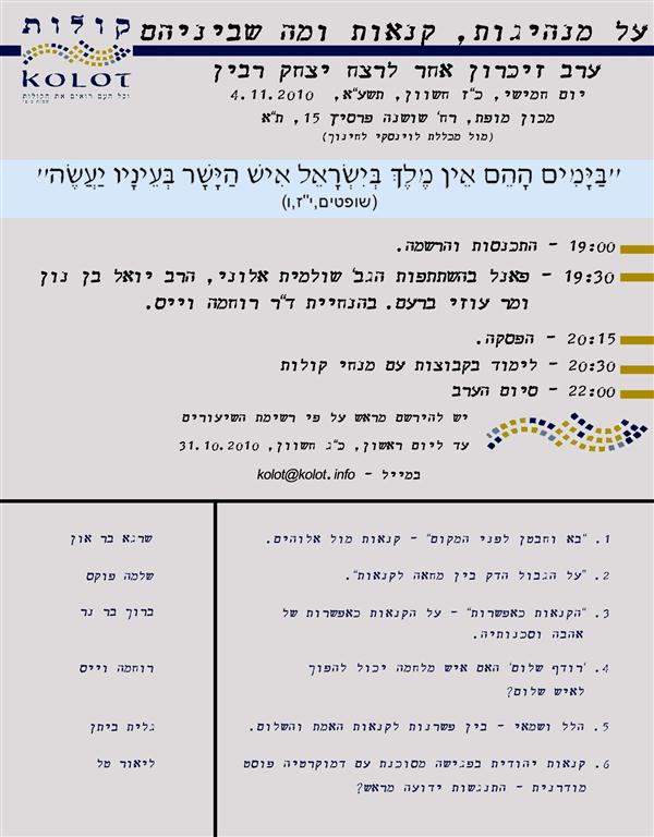בית המדרש "קולות", יקיים ביום חמישי הקרוב, 4.11.10, "ערב זיכרון אחר לרצח רבין", שכולו לימוד והעמקה, במטרה לקיים שיח שונה על רצח רבין, שאינו מתעסק בזווית הפוליטית המקובלת, הטעונה כל כך בחברה הישראלית, אלא נוגע בנושא מנקודת מבט יהודית, ומטפל בנושאים כגון קנאות דתית, דמוקרטיה ביהדות, אמת ושלום.