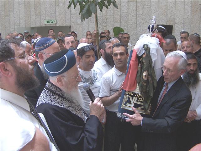 הרב מרדכי אליהו זצ"ל ונגיד בנק ישראל סטנלי פישר בהכנסת ספר תורה לבית הכנסת שבבנק (ארכיון)