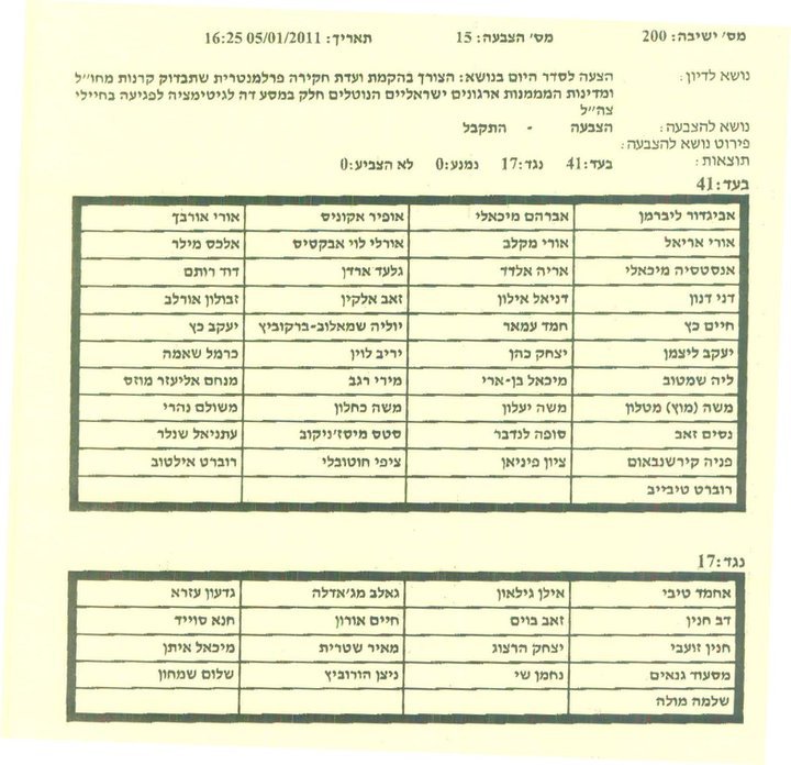 שמות חברי הכנסת שנעדרו מהישיבה על הקמת ועדת חקירה לארגוני זכויות האדם: