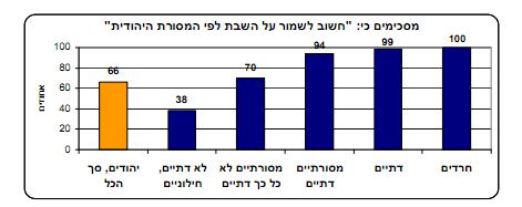 נתון בולט בסקר הוא ש66% מסכימים כי חשוב לשמור על השבת לפי המסורת היהודית. בפילוח לפי מגזרים, לא קשה לנחש שאצל החרדים, הדתיים והמסורתיים, ההסכמה תגיע לכמעט 100% אלא שאפילו אצל החילונים מדובר ב 38% הרואים ערך בשמירת השבת.