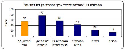 מהסקר עולה כי 80% מהיהודים בישראל סבורים כי לדת יש השפעה חזקה על החיים במדינת ישראל. כשחילונים חשים זאת יותר מאשר דתיים וחרדים.