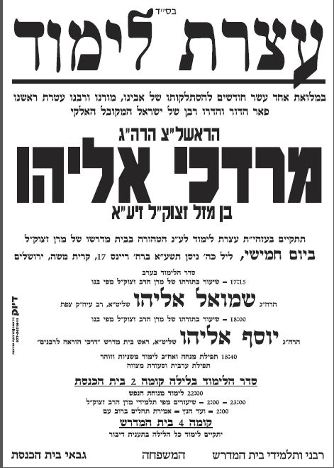 בירושלים תתקיים היום בערב עצרת לימוד לזכרו של הראשון לציון הרב מרדכי אליהו זצ"ל, במלאות 11 חודשים לפטירתו. את השיעורים ילמדו בניו הרב שמואל אליהו והרב יוסף אליהו. שיעורי תורה ותיקונים יתקיימו כל הלילה עד לתפילת הנץ בבוקר.