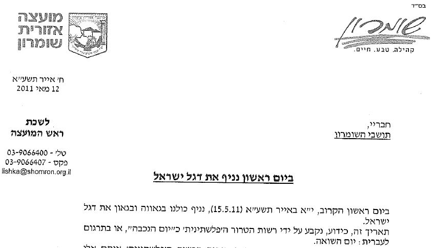 "ביום ראשון הקרוב, נניף כולנו בגאווה ובגאון את דגל ישראל… 'יום הנכבה' הוא בתרגום לעברית 'יום השואה', כך בחרה הנהגת הרשות ה'פלשתינית' לכנות את הקמת מדינת ישראל. ואכן, אין להתפלא על כך, בשעה שמי שעומד בראש אותה רשות טרור הוא מכחיש השואה אבו-מאזן."