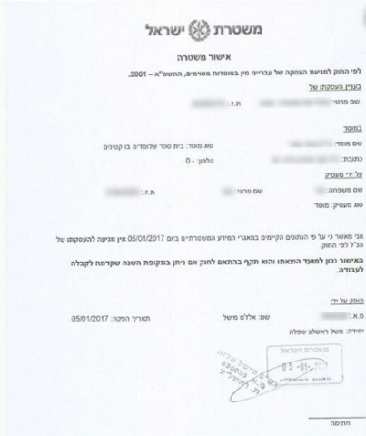 "לאחר בחינת בקשתו של נשוא פנייתכם, אל מול הקריטריונים הקבועים בחוק, ניתן האישור. נדגיש כי מדובר במסמך הקובע אם קיים אישור לפי חוק זה, ואין מדובר במתן מידע מן המרשם הפלילי. למותר לציין שהמשטרה המשיכה לטפל בחשדות מולו. הניסיון להציג את הדברים אחרת, אינו ראוי, חוטא לאמת ועומד באופן מנוגד לחוק".