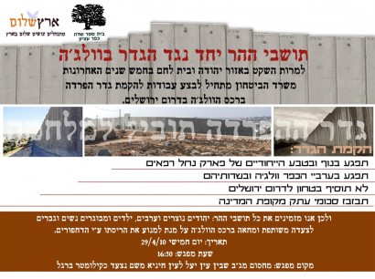 בסוף השבוע תתקיים הפגנה וצעדת מחאה שתורכב ממתנחלי גב ההר ופלסטינים מהכפר וולג'ה נגד גדר ההפרדה שאמורה לקום באזור. קבוצת המתנחלים אלו אנשי תנועת "ארץשלום" – תנועת השלום היוצאת מתוך המגזר המתנחלי. לטענתם, באזור יהודה ובית לחם יש שקט יחסית בחמש שנים האחרונות ואין סיבה ממשית להתחיל את ביצוע העבודות.