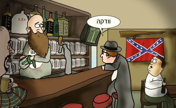 הקריקטורה מתבססת, ככל הנראה , על סצינה מסרט הוליוודי, בה נראה אדם בעל חזות חרדית נכנס לבית מרזח של אופנוענים נאצים, צועק "שבת שלום", תוקף את הברמן ואת הלקוחות ומעלה אש בפתח המוסד "המכובד". http://www.youtube.com/watch?v=oHyuf47UvZQ