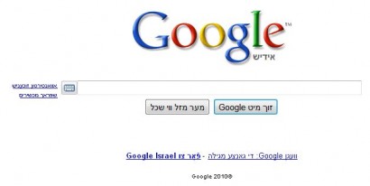 האתר החשוב ביותר ברשת כיום, הוא גוגל. ומסתבר שאופציית החיפוש עובדת גם ביידיש, תוכלו למצוא כל אתר אין דער אלע וועב. שימו לב לתרגום של הכפתור 'יותר מזל משכל'.