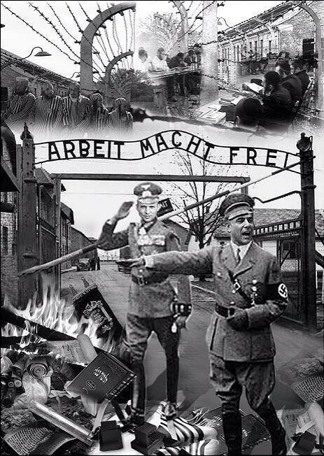 בתמונה שמופצת ברשתות החברתיות ובווטסאפ נראים יאיר לפיד ונפתלי בנט במדי קצינים נאציים מצדיעים שורפים גמרות וספרי תורה. דמויותיהם נמצאות מתחת לשער מחנה ההשמדה אושוויץ כשבחלק אחר של התמונה נראים בחורי ישיבה חרדיים במדי אסירים יהודים במחנה, יושבים ולומדים.