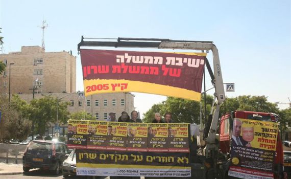 ההפגנה, שנערכה במקביל לישיבת הממשלה השבועית, כללה מיצג על גבי משאית, אשר דימה את ישיבת שרי הממשלה, ומעליו כרזת ענק: "ביבי חוזר על תקדים שרון". סביב שולחן הממשלה המאולתר ישבו מתנחלים, כשעל פניהם מסכות של שרי הממשלה שהפכו בעבר את האג'נדה הפוליטית שלהם מימנית לשמאלית: אריאל שרון, בנימין נתניהו, אריה דרעי ואהוד אולמרט.