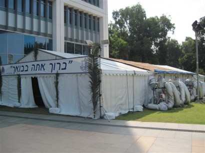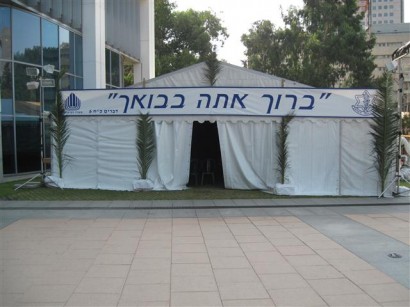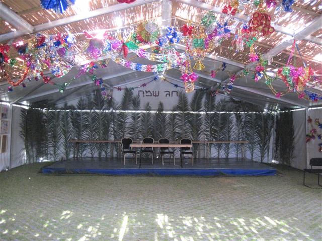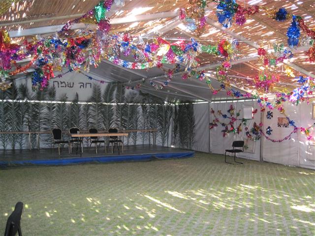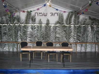 בימת המכובדים תחת גג הפלסטיק, גם בסוכה כשרה אסור לאכול שם (סרוגים)