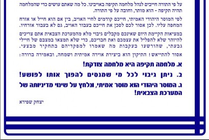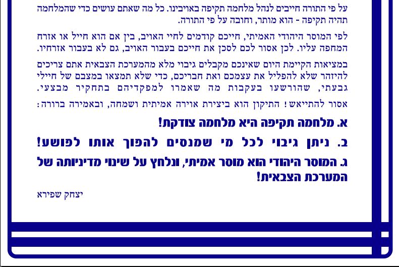 הרב שפירא מסיים את מכתבו באמירה: "מלחמה תקיפה היא מלחמה צודקת!".