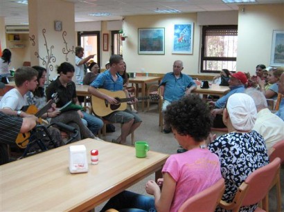 המתנדבים מנגנים ושרים באחד מבתי האבות בירושלים (יח"צ)