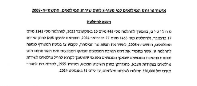 "בהמשך להחלטה מס' 945 מיום 10 באוקטובר 2023, ובהתאם לחוק שירות המילואים, לאשר את הצעת שר הביטחון, אשר מסמיך את ראש הערכת המבצעים שבאגף המבצעים ואת ראש תחום גיוס וכוננות, לקרוא בצו למספר מירבי של 350,000 חיילים לשירות מילואים, עד ליום ה-31 באוגוסט 2024".