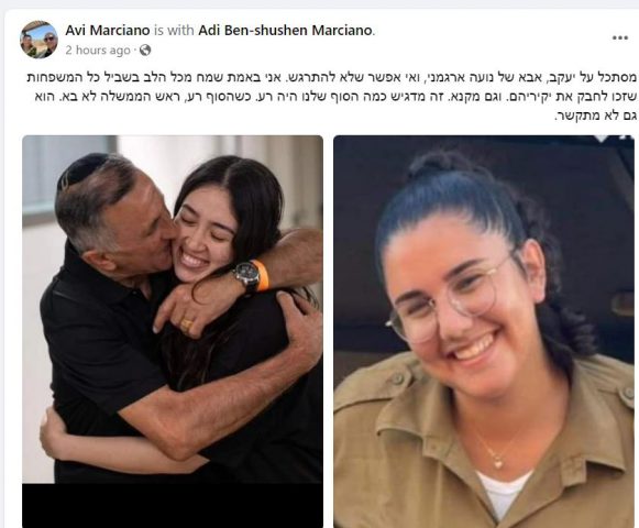 שחרור החטופים בנוסיראת. אבי מרציאנו, אביה של החטופה נועה מרציאנו הי"ד שנחטפה ונרצחה בשבי חמאס, וגופתה נמצאה ליד בית החולים שיפאא, פרסם היום פוסט כואב, בו השווה בין הסיום העצוב לחטיפת בתו, לבין שחרור החטופים.