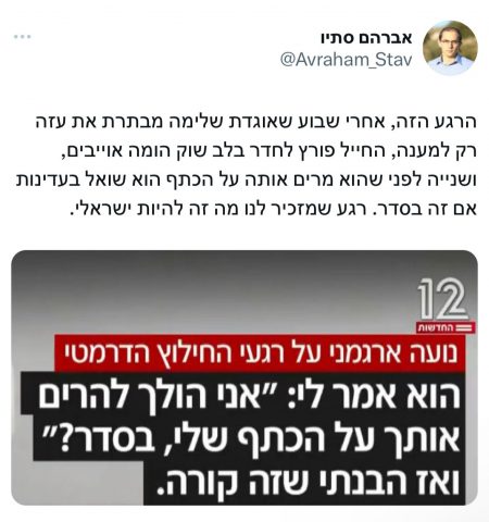 הרב אבהרם סתיו כתב בחשבון הטוויטר שלו: "הרגע הזה, אחרי שבוע שאוגדת שלימה מבתרת את עזה רק למענה, החייל פורץ לחדר בלב שוק הומה אויבים, ושנייה לפני שהוא מרים אותה על הכתף הוא שואל בעדינות אם זה בסדר. רגע שמזכיר לנו מה זה להיות ישראלי".
