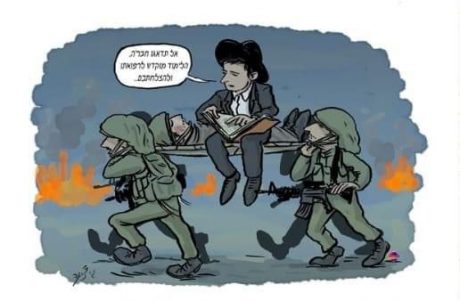קריקטורה מדייקת יותר היתה אם החור ישיבה שעל האלונקה היה שולף אץ הארנק של החייל , שזה בדיוק המציאות של ימינו בה החרדים לא נושאים בנטל ועוד מעזים לגזול את ממונן של ישראל , כפי שציין הרמב"ם שמי שרוצה להתפרנס מן התורה יהפוך לליסטים .