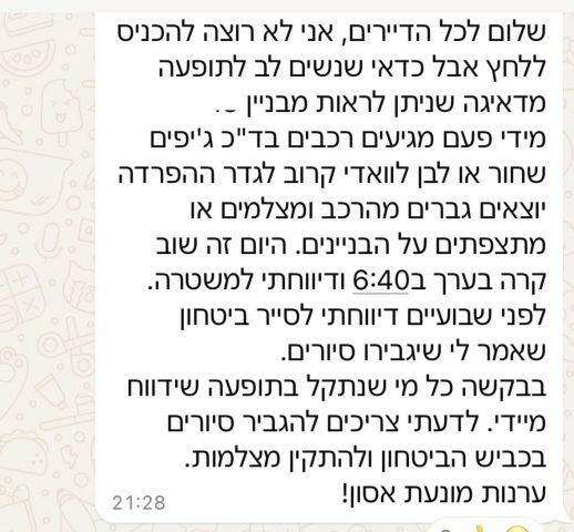 "שלום לכל הדיירים, אני לא רוצה להכניס ללחץ אבל כדאי שנשים לב לתופעה מדאיגה שניתן לראות. מידי פעם מגיעים רכבים בד"כ ג'יפים שחור או לבן לוואדי קרוב לגדר ההפרדה, יוצאים גברים מהרכב ומצלמים או מתצפתים על הבניינים. היום זה שוב קרה בערך ב6:40 ודיווחתי למשטרה.