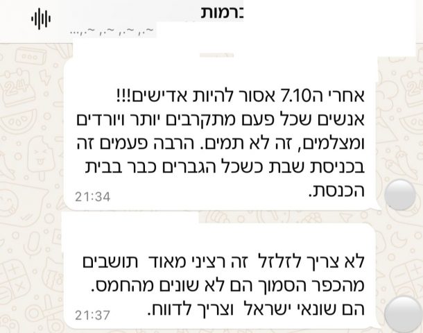 בקבוצה החל דיון ער בנושא ודייר נוסף הגיב: "אחרי ה-7 באוקטובר אסור להיות אדישים! אנשים שכל פעם מתקרבים יותר ויורדים ומצלמים זה לא תמים. הרבה פעמים זה קורה בכניסת שבת כשכל הגברים כבר בבית כנסת". שכן נוסף הדגיש: "לא צריך לזלזל, זה רציני מאוד. תושבים מהכפר הסמוך לא שונים מחמאס. הם שונאי ישראל וצריך לדווח".