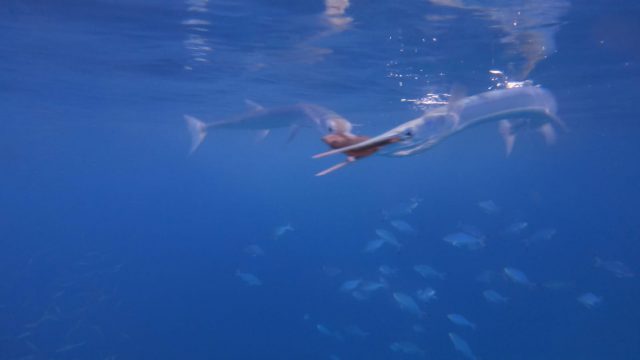 בכל הסרטון אני רואה שני דגי ברקודה נלחמים על דג שניצוד, עד שצוללן מפריע להם ואחד הברקודות ברח והשני זכה בדג. מעבר לזה, לא רואים שום להקת דגים, אולי לשניה אחת בתחילת הסרטון