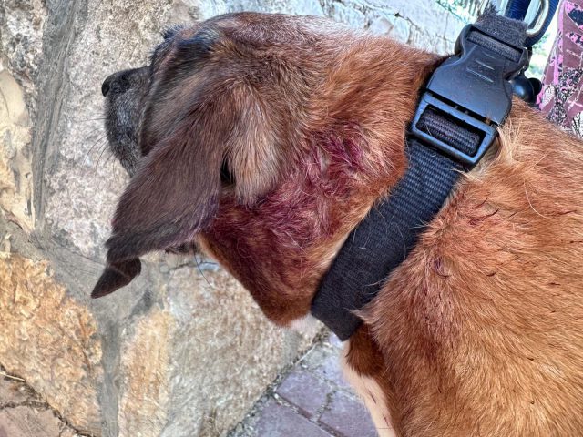 בשלב זה כפי שעלה מחקירת המקרה, הקורבן הצליח לחמוק מפגיעת הסכין ואילו הנאשם החל לרוץ לעבר אשתו של הקורבן ששהתה בחדר המדרגות יחד עם כלבם של בני הזוג. בשלב מסוים דקר הנאשם את הכלב וגרם לו חבלה קשה באוזנו ולאחר מכן ברח לכיוון קיוסק סמוך בהמשך הרחוב. בעקבות פציעתו, פונה הכלב לטיפול וטרינרי ועבר הליך כירורגי.