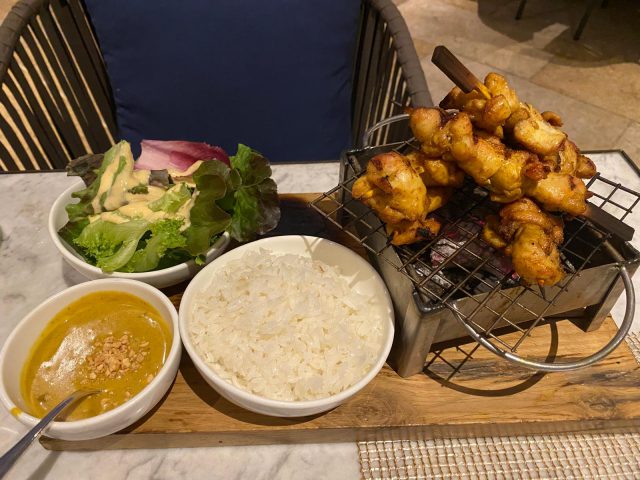 שיפודי הפרגית הגיעו לצד אורז לבן, חסה פריכה ורוטב מיוחד של קארי, חמאת בוטנים וחלב קוקוס, ובהמלצת השף איגדנו את הבשר, הרוטב, והחסה לביס אחד טעים ומיוחד. השילוב בין חמאת הבוטנים לבשר מקורי ומפתיע, אך גם מי שפחות יתחבר יהנה מבשר איכותי וטעים.