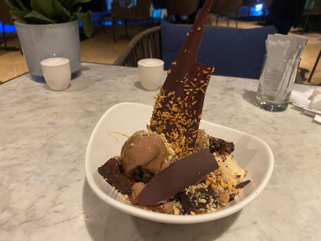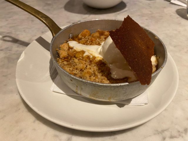 ובאשר לקארמבל, בניגוד לקינוחים אחרים דומים שיצא לנו לטעום, התפוחים פה לא היו חתוכים דק ומדובר בחתיכות גדולות פריכות וטעימות. המנה מגיעה עם כדור גלידה מעליה, שבקיץ הישראלי נמס מהר יותר מהרגיל ומתפרס על כל המנה, מה שמונע מאיתנו להחליט על האיזון בין שני חלקי המנה והטעמים שלה.