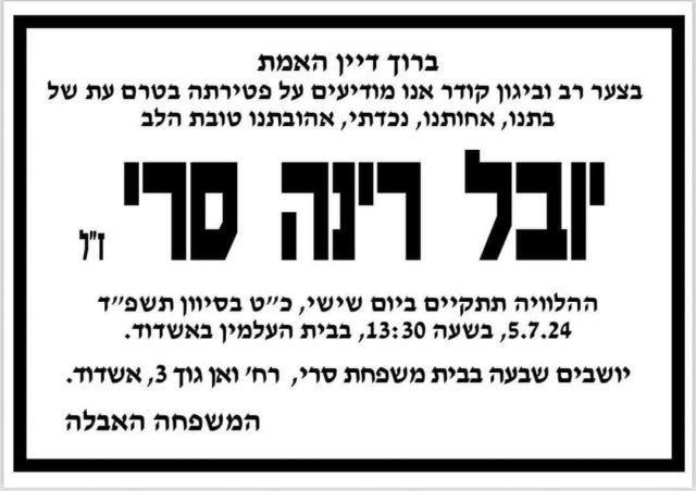 יובל סרי, בתו של איש התקשורת ברק סרי, הלכה הלילה לעולמה בגיל 30 בנסיבות טרגיות. סרי נמצאה ללא רוח חיים באזור נס ציונה. נסיבות המקרה אינן ידועות. ההלוויה תתקיים היום בשעה 13:30 בבית העלמין באשדוד.