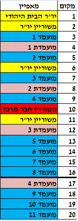 כך אמורה להראות טבלת המועמדים הרצים בבית היהודי. בהנחה שהמפלגה מקבלת בסקרים 16 מנדטים, 8 גברים ו-3 נשים המתמודדים בפריימריז ייכנסו למקומות ריאליים.