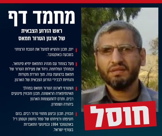 כאמור מוקדם יותר היום הודיעו צה"ל ושב"כ כי בפעילות משותפת של צה״ל ושב״כ, בתאריך ה-13 ביולי 2024 מטוסי קרב תקפו במרחב ח'אן יונס וכעת, לאחר בדיקה מודיעינית, ניתן לאשר כי בתקיפה חוסל מחמד דף, מפקד הזרוע הצבאית ומספר שתיים בארגון הטרור חמאס בעזה, אשר תכנן והוציא לפועל את הטבח הרצחני בשבעה באוקטובר.