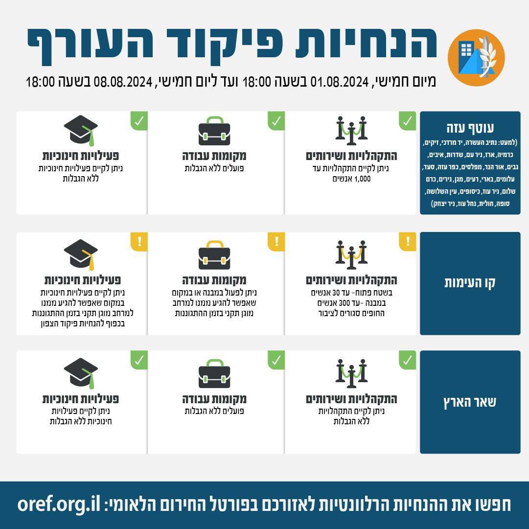 פיקוד העורף קבע את ההנחיות הבאות מהערב – יום חמישי, 1 באוגוסט 2024, בשעה 18:00- ועד ליום חמישי, 8 באוגוסט 2024, בשעה 18:00.