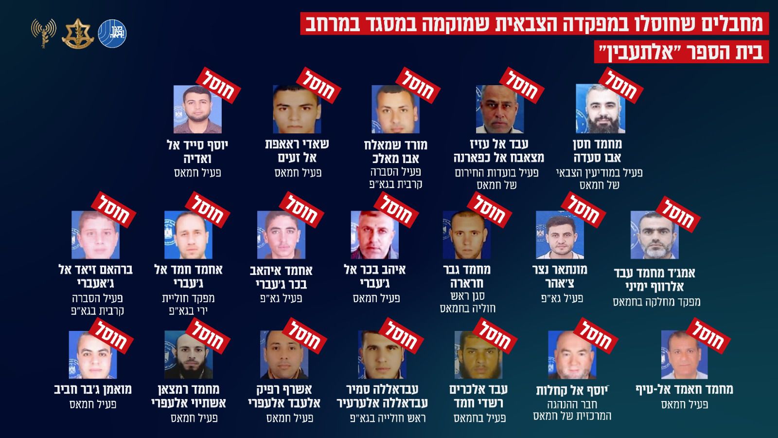 במהלך השבועות האחרונים, המודיעין שלנו עקב מקרוב אחר מתקן צבאי פעיל של חמאס והג'יהאד האסלאמי, שבו פעלו כ-24 חמושים של חמאס והג'יהאד האסלאמי. פרסמנו היום את שמותיהם של 19 מהמחבלים שפעלו במתחם זה. יש לנו גם אינדיקציות מודיעיניות לכך שהמחבל אשרף ג'ודה, מפקד חטיבת מחנות המרכז של הג'יהאד האיסלאמי, היה במתחם. מתקן צבאי זה היה מוטמע בתוך בניין בית הספר ׳אל-תבאעין׳ בעיר עזה.