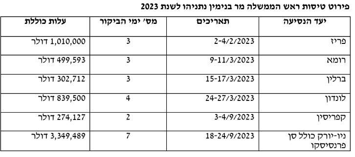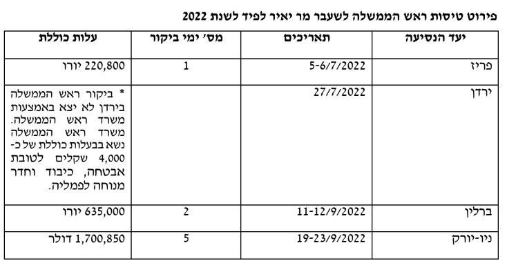 בעקבות בקשה של התנועה לחופש המידע, מפרסם היום (ראשון) משרד ראש הממשלה את עלויות ביקורי ראשי הממשלה נתניהו, בנט ולפיד בחו"ל בשלוש השנים האחרונות.