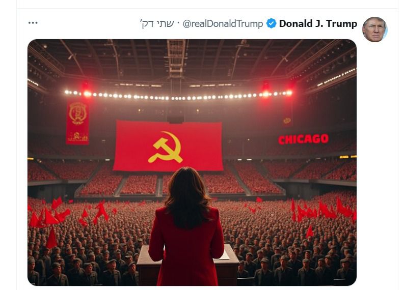 רגע לפני תחילת הוועידה הדמוקרטית בשיקגו, נשיא ארה"ב לשעבר והמועמד הרפובליקני דונלד טראמפ חזר לטוויטר היום (ראשון) כשפרסם ציוץ עם תמונה שככל הנראה נוצרה בבינה מלאכותית, בה תקף את יריבתו המסתמנת קמלה האריס בעקבות הצעותיה לחוקים סוציאליסטים.