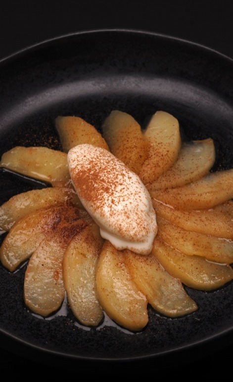 לתפוחים: מקלפים את התפוחים וחותכים אותם לפלחים, ומניחים בתנור עם פונקציית אדים למשך 20 דקות. ממיסים את החמאה בסיר ומערבבים עם הסוכר עד שהוא נמס ומוסיפים את התבלינים. משלבים את התפוחים האפויים עם תערובת החמאה והסוכר למשך 10 דקות נוספות בתנור עם חום עליון ותחתון. לסיום מגישים עם כדור גלידת מסקרפונה.