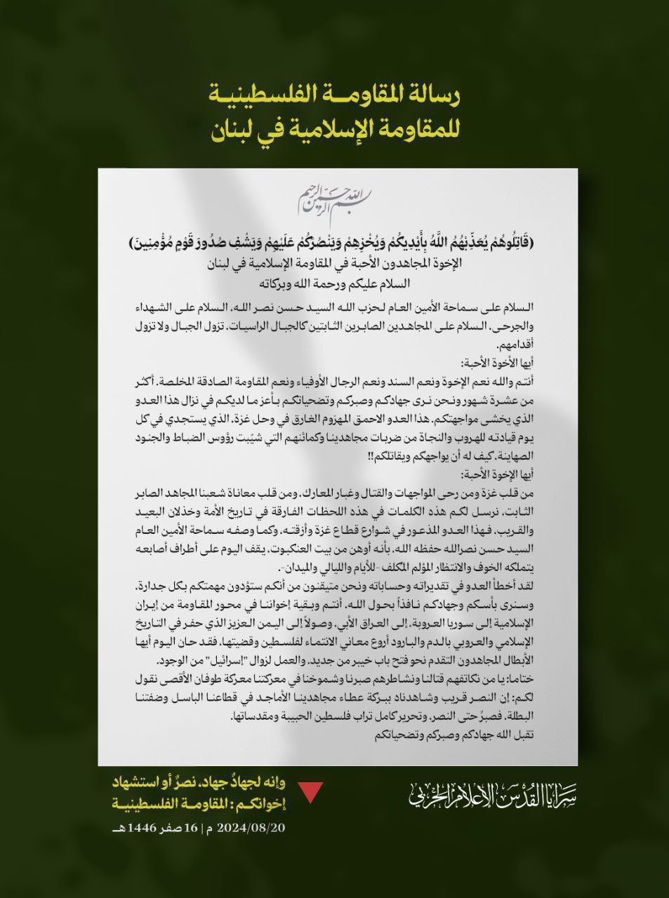 מדובר אמנם באיגרת תודה של עזה לחיזבאללה, אך זוהי גם קריאה לעזרה בה הם מבקשים מארגונו של נסראללה לסייע להם להילחם בישראל.