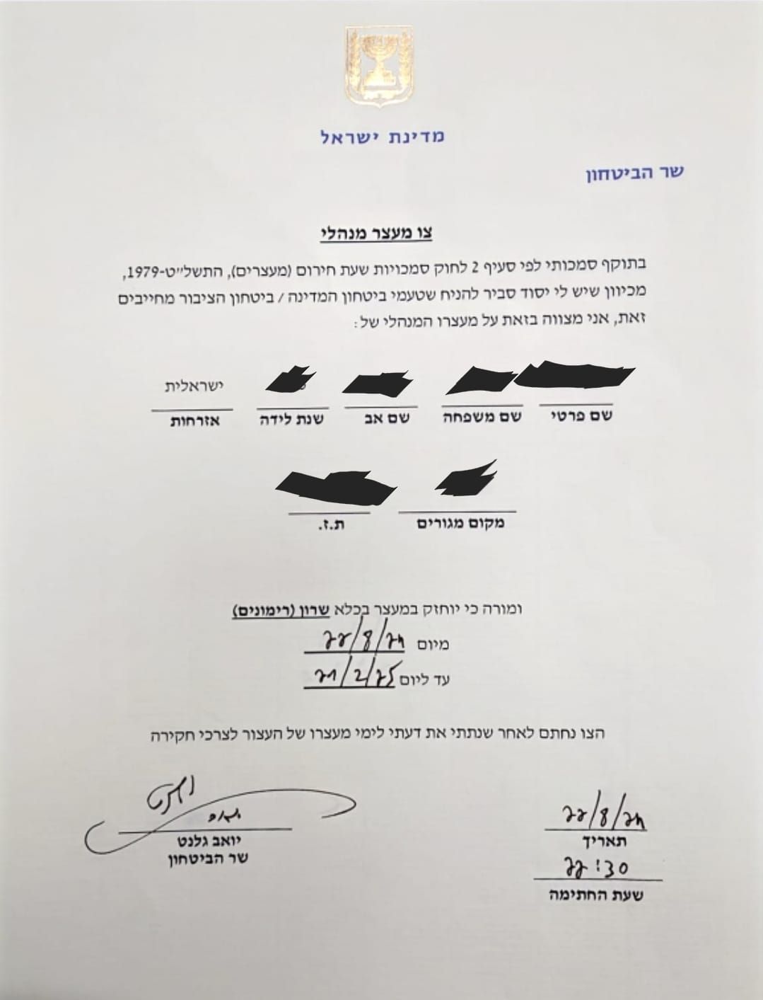 ללא ראיות וללא משפט: השר גלנט הוציא צווי מעצר מנהליים כנגד 4 מתיישבים יהודים