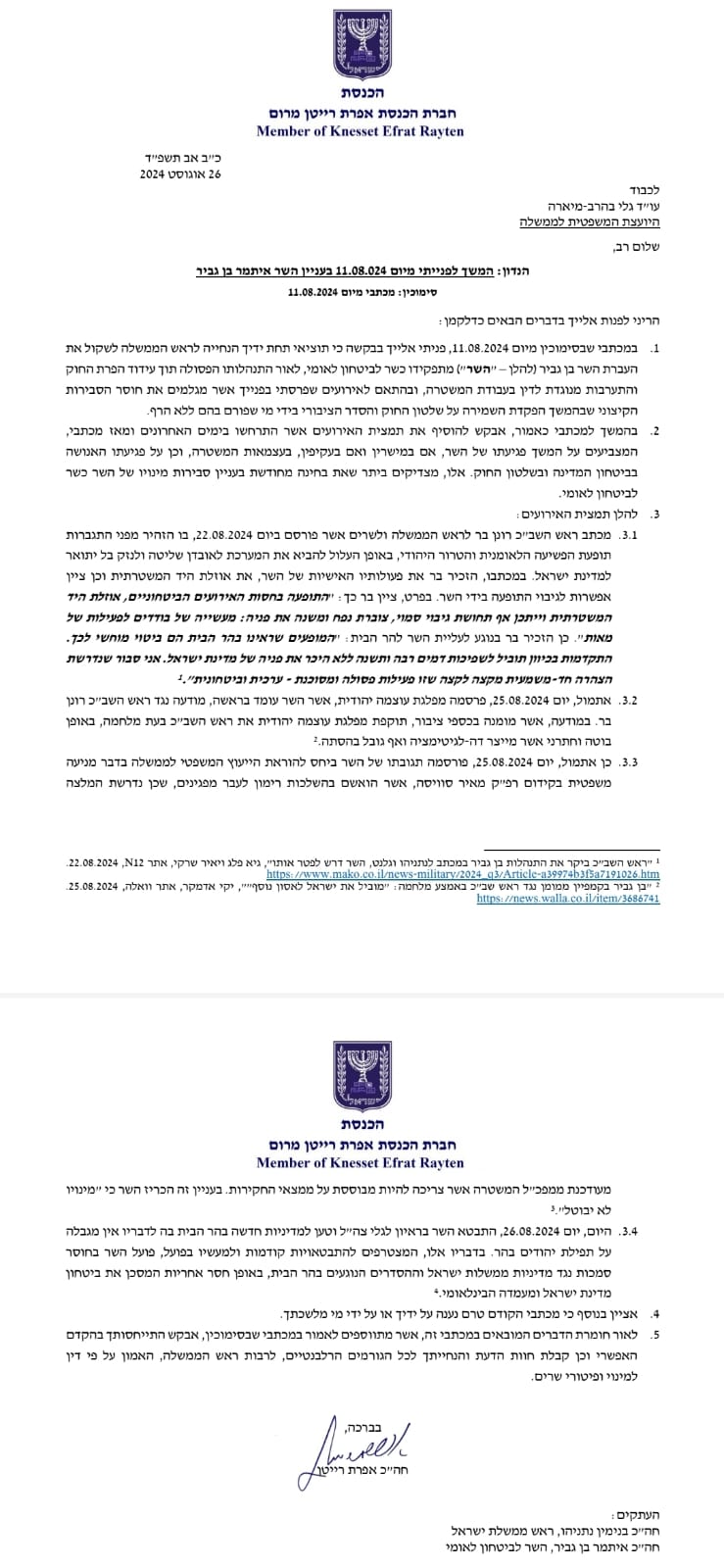 במכתבה, כתבה רייטן ליועמ"שית: "בהמשך למכתבי כאמור, אבקש להוסיף את תמצית האירועים אשר התרחשו בימים האחרונים ומאז מכתבי, המצביעים על המשך פגיעתו של השר, אם במישרין ואם בעקיפין, בעצמאות המשטרה, וכן על פגיעתו האנושה בביטחון המדינה ובשלטון החוק. אלו, מצדיקים ביתר שאת בחינה מחודשת בעניין סבירות מינויו של השר כשר לביטחון לאומי".