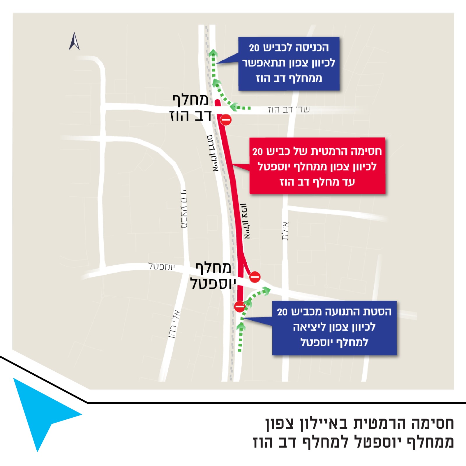 להלן הסדרי התנועה הזמניים שיתבצעו בשעות אלו: כביש 20 ייחסם לתנועה לנוסעים בכיוון צפון, בקטע שבין מחלף יוספטל עד מחלף דב הוז* לא תתאפשר הכניסה לכביש 20 לכיוון צפון ממחלף יוספטל* הכניסה לכביש 20 לכיוון צפון ממחלף דב הוז תתאפשר כרגיל