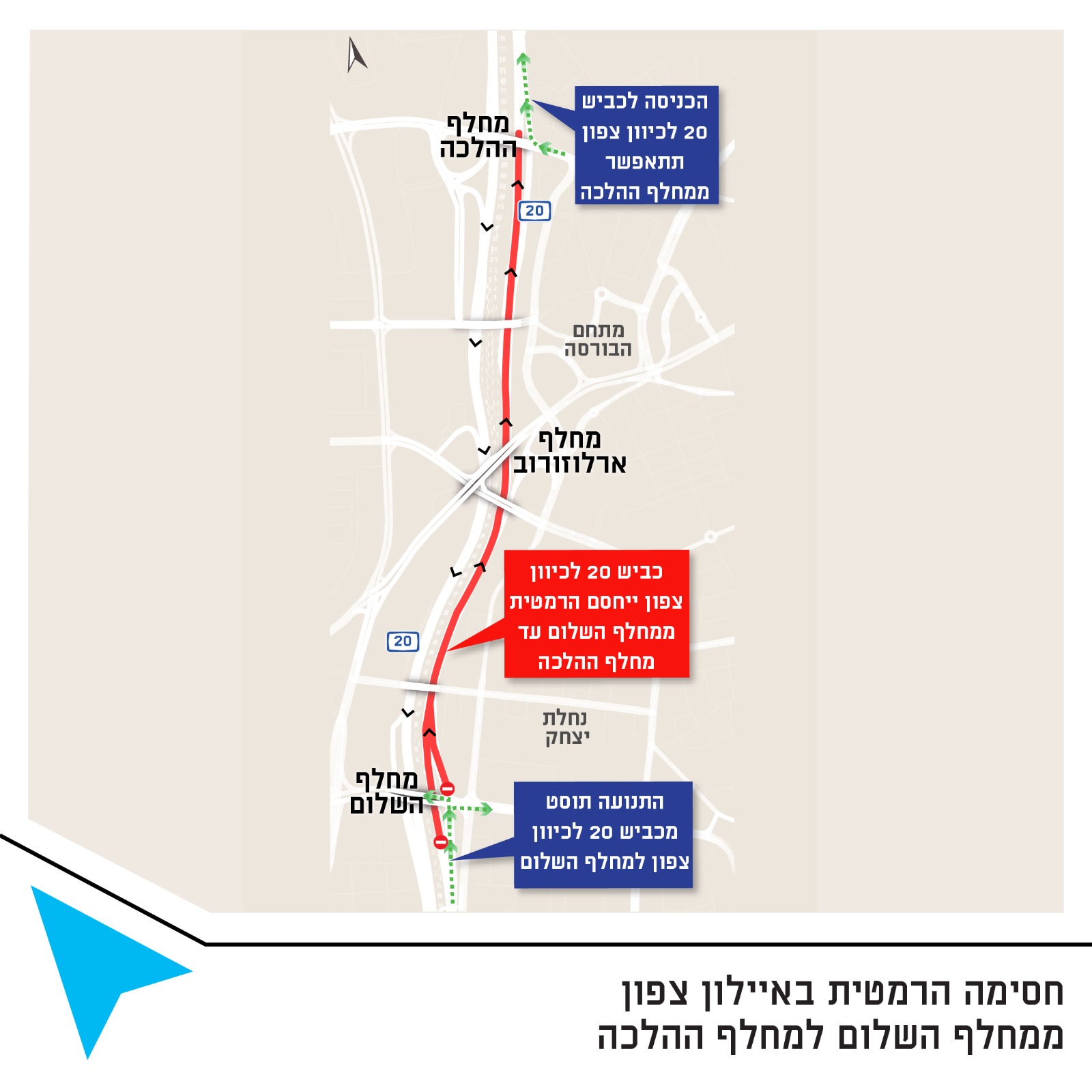 להלן הסדרי התנועה הזמניים שיתבצעו בשעות אלו: כביש 20 לכיוון צפון ייחסם הרמטית בקטע שבין מחלף השלום למחלף ההלכה, ולא תתאפשר הכניסה אליו ממחלף השלום* הכניסה לכביש 20 לכיוון צפון ממחלף ההלכה תתאפשר כרגיל