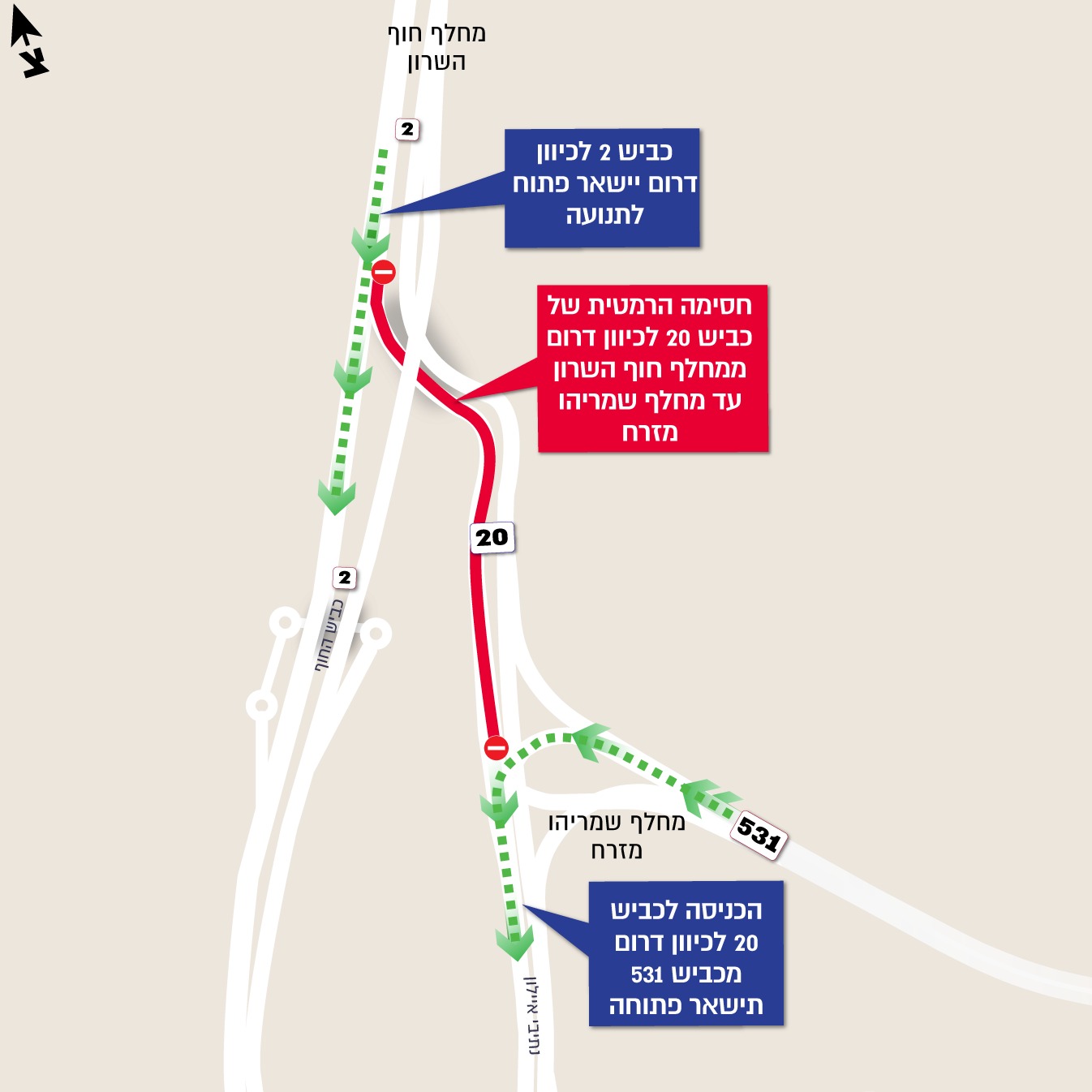 להלן הסדרי התנועה הזמניים שיתבצעו בשעות אלו: כביש 20 ייחסם לתנועה לנוסעים בכיוון דרום, בקטע שבין מחלף חוף השרון למחלף שמריהו מזרח והתנועה תוסט לכביש 2.