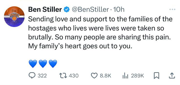 בפוסט שפרסם הלילה (שלישי) ב-X, כתב השחקן המצליח: "שולח את אהבתי ותמיכתי למשפחות החטופים, שחייהם נלקחו מהם באופן כל כך אכזרי. הרבה אנשים משתתפים בכאב הזה. ליבי יוצא אליכם" והוסיף שלושה לבבות כחולים.