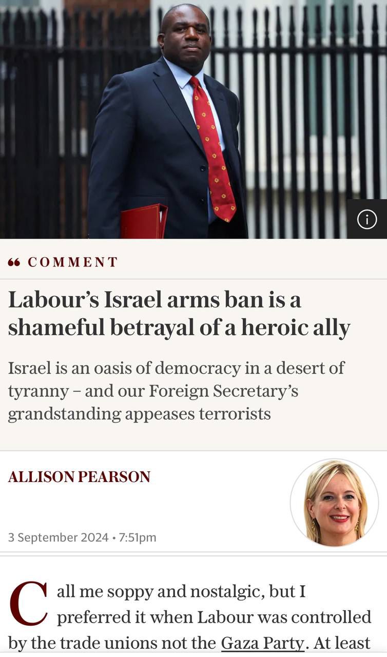 "חרם הנשק של הלייבור הוא בגידה מבישה בבעלת ברית גיבורה", נכתב בכותרת הכתבה. ״להטיל עיצומים בנימוק של פגיעה בחפים מפשע יום אחרי שחמאס רצח שישה חפים מפשע זו סאטירה במיטבה״. נכתב בכתבה.