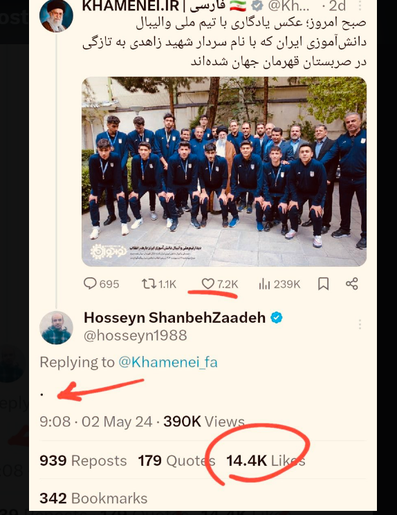 מערכת המשפט האיראנית דנה למאסר בלוגר בשם חוסיין שנבהזאדה. הבלוגר – מתנגד משטר ידוע, הגיב לציוץ בחשבונו הרשמי של המנהיג עלי חמינאי והואשם בהשפלת המשטר, בשל כמות הלייקים שעלתה על ציוצו של המנהיג העליון.