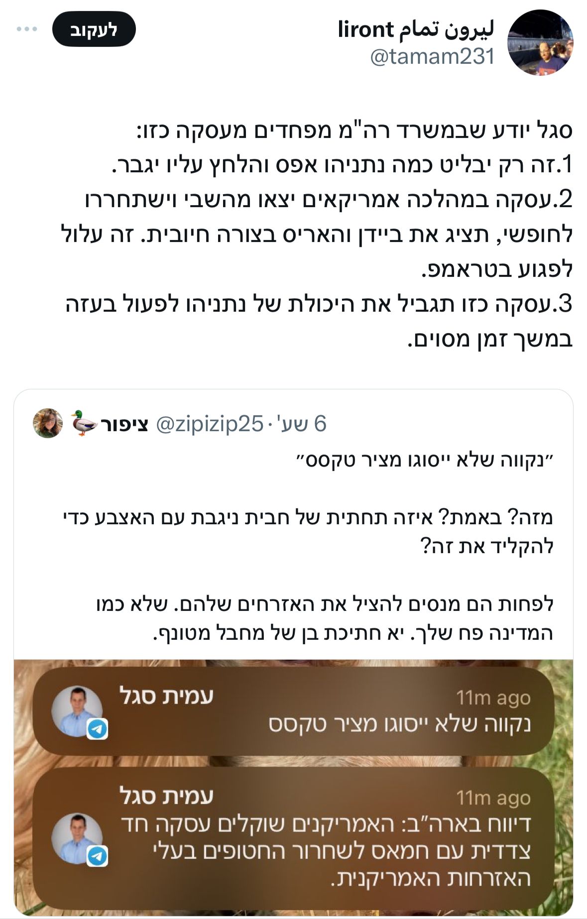 הכתב הפוליטי של ערוץ 12 עמית סגל, התייחס היום לדיווחים לפיהם ארה"ב מנסה לקדם הצעה חד צדדית עם חמאס לשחרור חטופים בעלי אזרחות אמריקנית וכתב: "דיווח בארה"ב: האמריקנים שוקלים עסקה חד צדדית עם חמאס לשחרור החטופים בעלי האזרחות האמריקנית. נקווה שלא ייסוגו מציר טקסס".