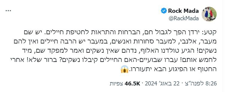 "קטע: ירדן הפך לגבול חם, הברחות והתראות לחטיפת חיילים. יש שם מעבר, אלנבי, למעבר סחורות ואנשים, במעבר יש הרבה חיילים ואין להם נשקים!", כתב הצייצן האלמוני בטוויטר.