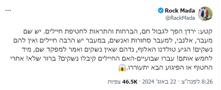 "קטע: ירדן הפך לגבול חם, הברחות והתראות לחטיפת חיילים. יש שם מעבר, אלנבי, למעבר סחורות ואנשים, במעבר יש הרבה חיילים ואין להם נשקים!", כתב הצייצן האלמוני בטוויטר.