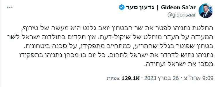 ח"כ גדעון סער בעצמו, טען כי פיטורי גלנט במרץ 2023 הם "טירוף" וכתב בחשבון הטוויטר שלו: "החלטת נתניהו לפטר את שר הביטחון יואב גלנט היא מעשה של טירוף, המעידה על העדר מוחלט של שיקול דעת, אין תקדים בתולדות ישראל לשר ביטחון שפוטר בגלל שהתריע, כמתחייב מתפקידו על סכנה בטחונית.
