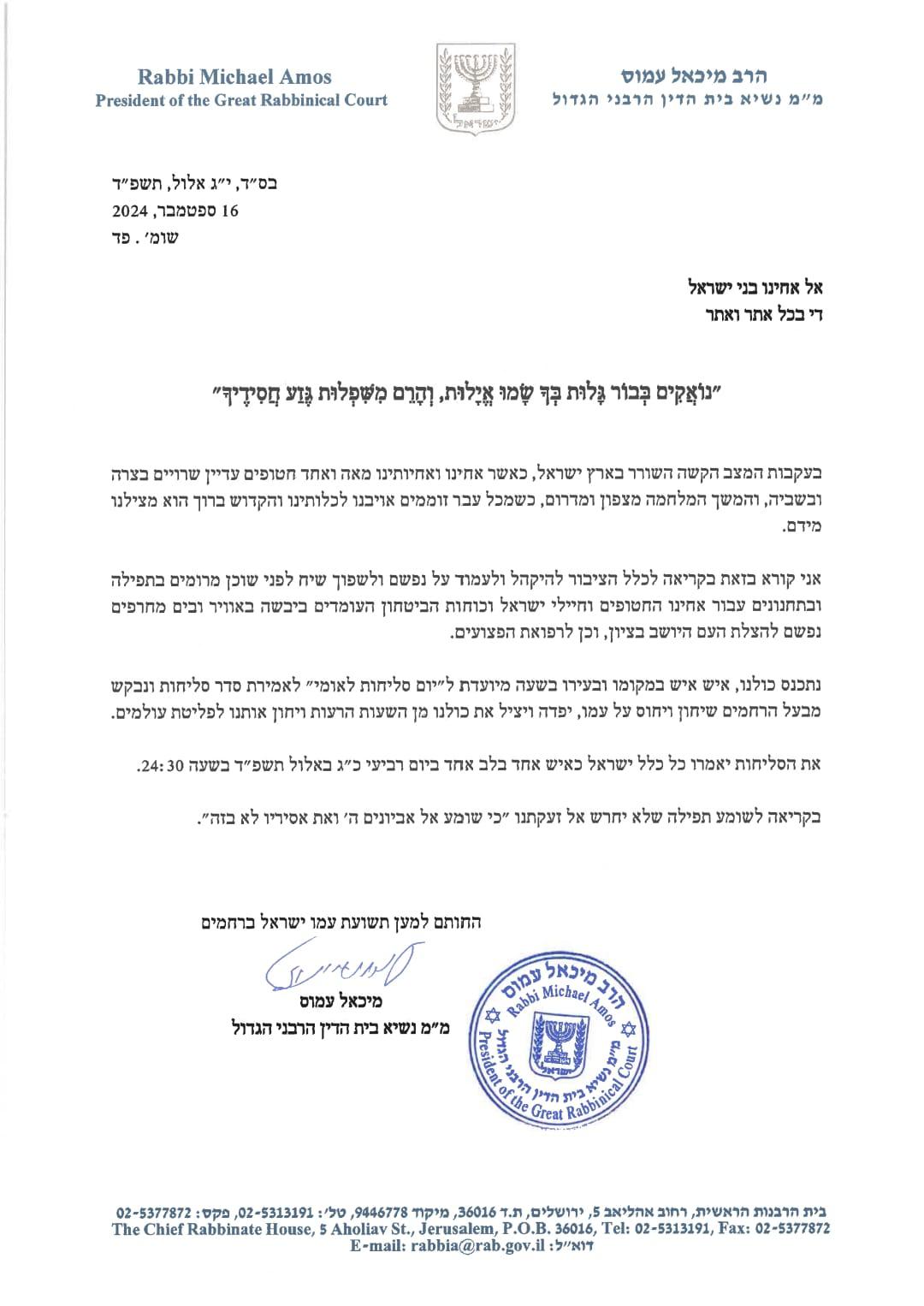 "נתכנס כולנו, איש איש במקומו ובעירו בשעה מיועדת ל"יום סליחות לאומי" לאמירת סדר סליחות ונבקש מבעל הרחמים שיחון ויחוס על עמו, יפדה ויציל את כולנו מן השעות הרעות ויחון אותנו לפליטת עולמים" המשיך הרב. "את הסליחות יאמרו כל כלל ישראל כאיש אחד בלב אחד ביום רביעי כ"ג אלול תשפ"ד בשעה 24:30 בלילה".