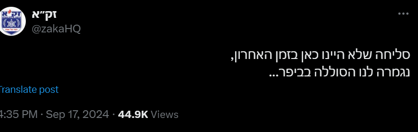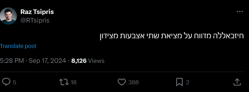 כאמור, הערב (שלישי), פיצוץ מסתורי אירע בפרברי ביירות כאשר מכשיר קשר שהוחזק בידי פעילי חיזבאללה התפוצץ, והוביל לפציעתם של כ-1,000 איש, ולמוות של מספר חברים בארגון הטרור. בישראל טרם לקחו אחריות על האירוע, שמוגדר בכלי תקשורת ערביים כ"מבצע מסתורי ישראלי", פיקוד העורף לא עדכן הנחיות מיוחדות לציבור.