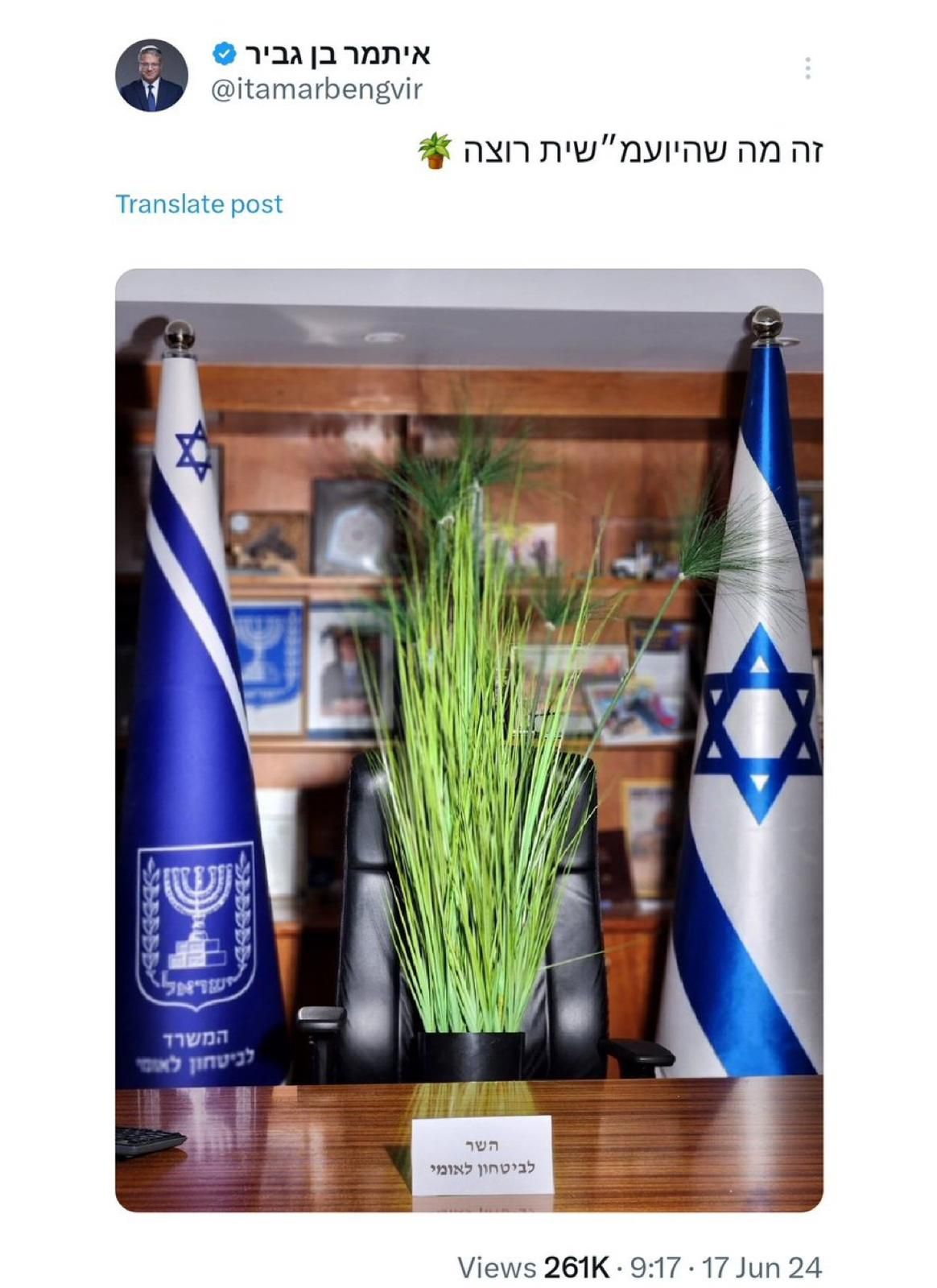 אחד הפרסומים שצייץ בן גביר היה עציץ שהוצב על כיסא לשכתו במשרד לביטחון לאומי והוסיף את הכיתוב: "זה מה שהיועמ"שית רוצה".